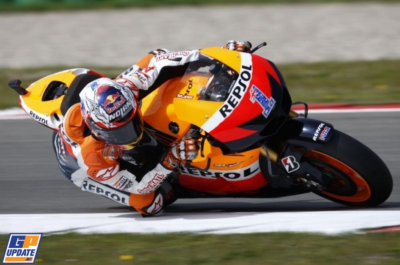 中盤までトップを快走していたストーナー、最終ラップにペドロサの真後ろで転倒、リタイヤとは