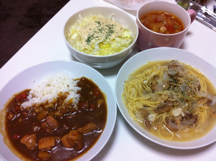 です。 ウマ飯 アサリのパスタ、カレーライス、トマトと野菜のスープなどなど