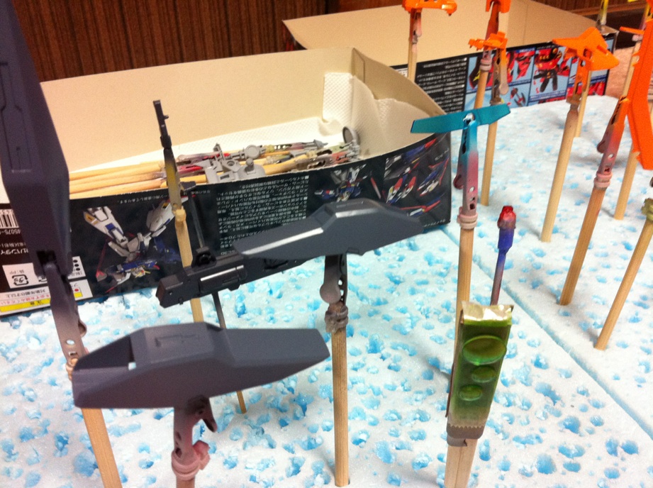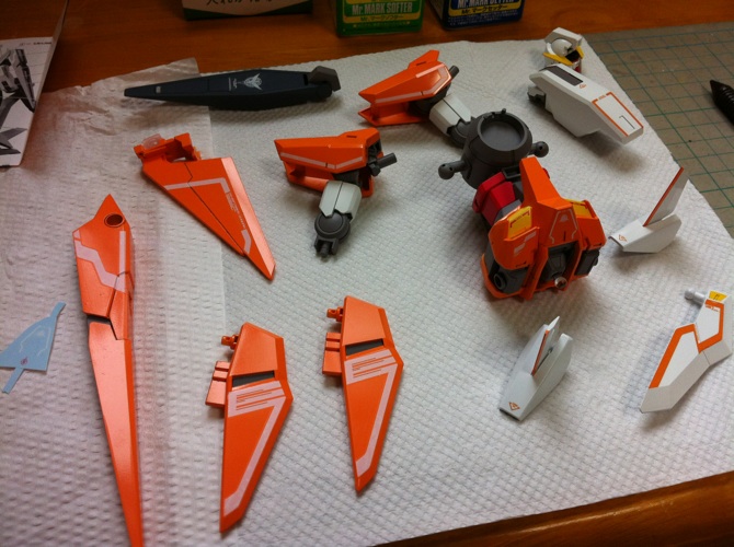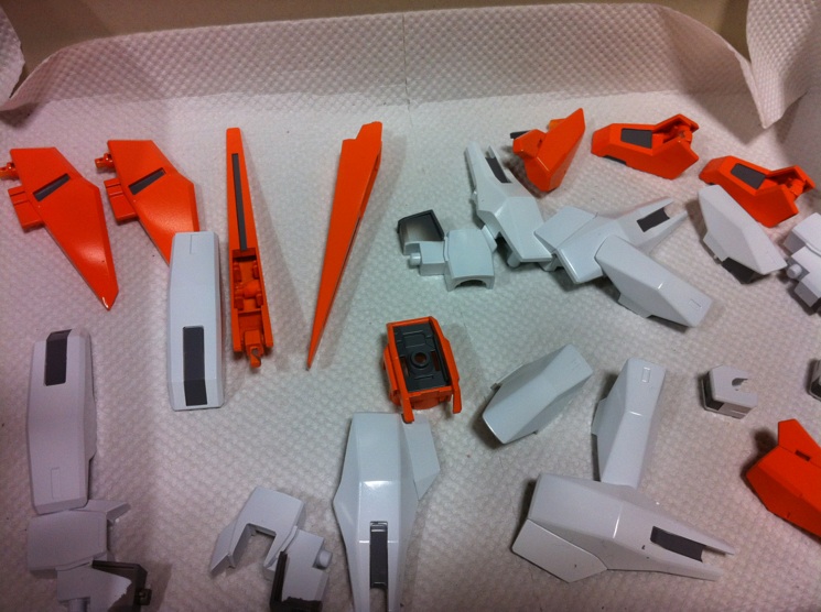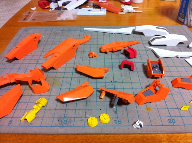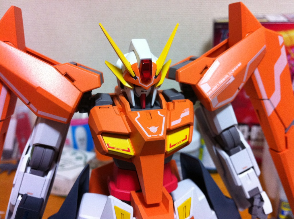昨年の完成品は4体(シナンジュヘッド込み)、今年は5体以上を目指したいよね そんな感じです。 今日も今日とてアリオス。 オレンジ色塗り終えたっす(順調)