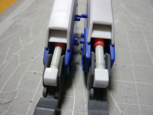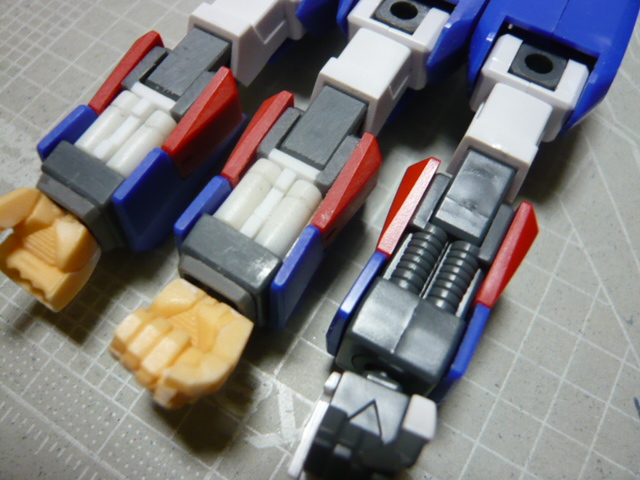 非変形、MS固定で作るので変形のための可動部を削除、その部分にはプラ板でそれ風のディティールを追加してみた 左が変形無視でディティールを追加したヤツ、右は素