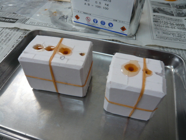 湯口などの加工をし輪ゴムでガッチリと固定したらレジンを流します。約5分で硬化しますので作業は手早く!!